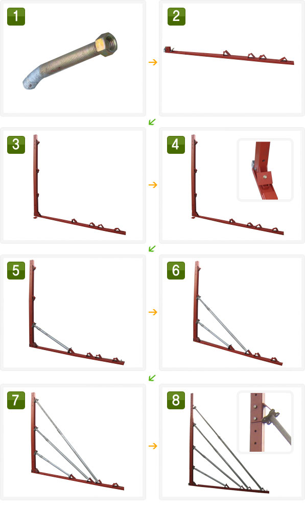 하부지지대에 상부지지대를 삽입 후 볼트로 고정한다.