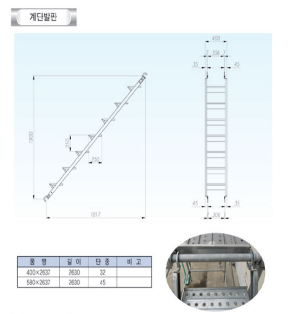 비계 용도로 사용시 가설공사 표준시방서 기준에 따라 수직재 플랜지 지간거리를 475m/m간격으로 하여 안전난간대 설치 기준에 맞게 제작
